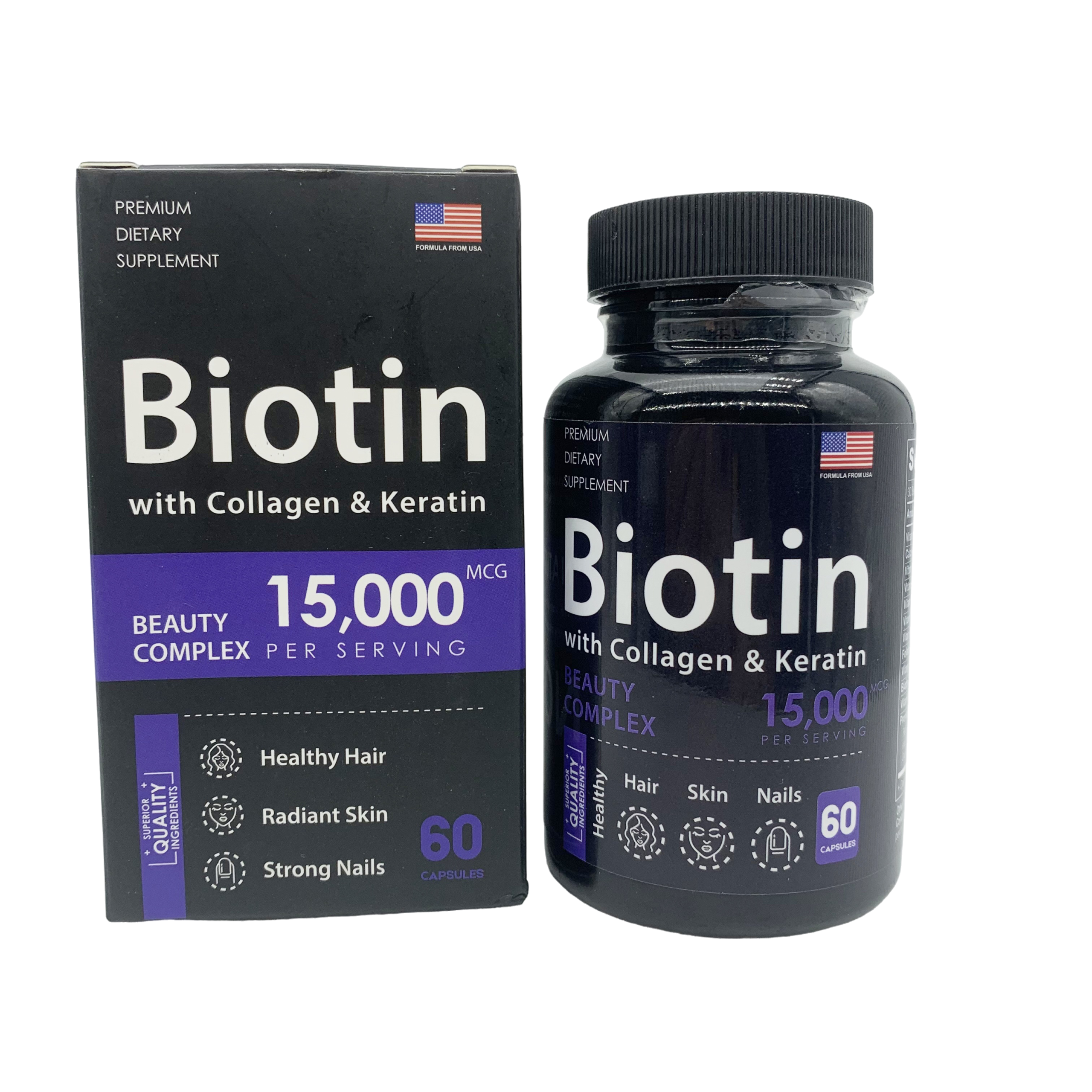 Sublimez votre éclat naturel avec notre complexe Biotin avec Collagène & Kératine, une formule de haute puissance conçue pour transformer la santé de vos phanères et de votre épiderme. Chaque portion délivre une concentration exceptionnelle de 15 000 mcg de biotine, agissant en synergie avec des nutriments essentiels pour une action régénératrice profonde. Présentée sous forme de gélules faciles à avaler et fabriquée avec expertise aux États-Unis, cette cure premium est la solution holistique pour ceux qui ne veulent faire aucun compromis entre science et beauté.